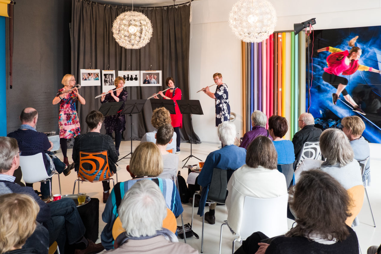 Op zondag 26 maart 2017 vond de 7e editie van de Huisconcerten Roden plaats: 38 concerten op 13 locaties. Ook dit jaar stelde Alfred Oosterman Fotografie de studio beschikbaar. Four Flutes, bestaande uit Marlies de Jager, Simone Kampherbeek, Leontien van Nesselrooij en Janine Siebesma concerteerden vier maal en speelden een diversiteit aan muziek. Barok, klassiek en Frans impressionisme, van filmmuziek tot jazz. Veel is speciaal geschreven voor dit fluitkwartet, en af en toe geven ze opdracht tot het maken van een bewerking van een bestaand stuk. In april 2016 won Four Flutes in het Limburgse Ittervoort de eerste prijs bij het Benelux Fluitconcours. De zaal heeft genoten, het was een mooie dag.
