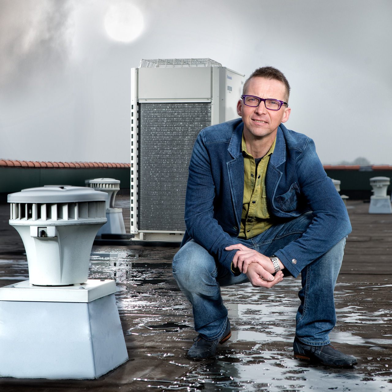 Bij Koude- & Warmtetechniek Noord-Nederland werken technische specialisten die zich ten behoeve van hun opdrachtgevers bezighouden met het bereiken en vasthouden van de juiste temperatuur. Koude- & Warmtetechniek Noord-Nederland adviseert, installeert en realiseert koel- en vriestechniek, airconditioning, warmtetechniek en luchtbehandelingsinstallaties bij het midden- en kleinbedrijf, bij zorginstellingen en bij scholen. Gebruikers van deze gebouwen zien de techniek niet, ze merken wel de effecten ervan. Om de installaties te kunnen fotograferen, voor onder meer de website, komt Alfred Oosterman regelmatig op een dak terecht. Op deze foto poseert eigenaar Edwin de Weerd op het dak van het Van der Valk Hotel Groningen-Zuidbroek. Mens en techniek in beeld gebracht.