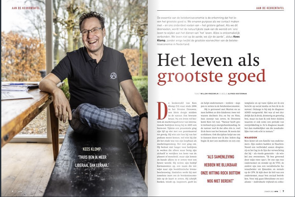 De nieuwste editie van ‘Het New Financial Magazine’ is uit. Een uitgebreid artikel over Kees Klomp met een portret dat ik van hem maakte. Kees Klomp is zonder enige twijfel de grootste voorvechter van de betekeniseconomie in Nederland. Via deze link kun je het artikel bekijken: https://www.newfinancialforum.nl/magazine/zomer-2021/6. Het ‘New Financial Magazine’ wil met best practices, schaamteloze ideeën, sprankelende inspiratiebronnen en scherpe visies een bijdrage leveren aan een gezonde en gerespecteerde financiële sector. Dit initiatief van Willem Vreeswijk is als onderdeel van de Stichting New Financial Forum dé exclusieve inspiratiebron van de ambassadeurs van de nieuwe financiële wereld.